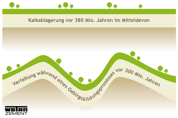 Ausgangsstoff der Zementherstellung ist der in der Natur vorkommende Kalkstein und Mergel. Unser Kalkstein entstand vor 380 Millionen Jahren aus Korallen des devonischen Meeres. Dieser wurde im Laufe der Jahrtausende von anderen Schichten überlagert und verfestigte sich zu Gestein. Nach Faltung und oberflächlichen Abtragung bildete sich die Hillesheimer Kalkmulde.