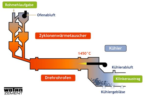 Das Rohmehl gelangt in die Ofenanlage (Zyklonwärmetauscher und Drehrohrofen), in der es bei einer Temperatur von ca. 1.450 Grad Celsius bis zur Sinterung gebrannt wird. Dadurch wird es chemisch zu Zementklinker umgewandelt. Nachdem der Klinker den Kühler passiert hat, kann er weiterverarbeitet werden.