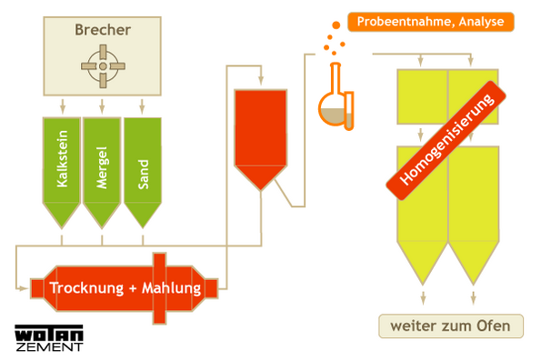 Kalk, Mergel und Sand werden in Mühlen mehlfein gemahlen. Ein eigenes Labor überwacht kontinuierlich die Zusammensetzung. Eine Homogenisierungsanlage mischt das fertige Rohmehl.