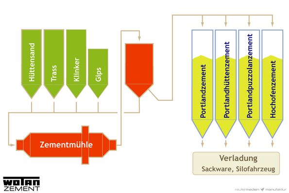 Zementmühlen mahlen den Klinker - je nach Sorte mit definierten Mengen verschiedener Hauptbestandteile den Zement. Über die Zugabe von Gips wird die Abbindezeit gesteuert. Das Fertiggut Zement kommt entweder in Säcken abgepackt oder lose in Silos gelagert zum Versand.