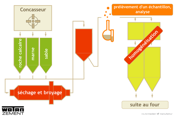 Le calcaire, la marne et le sable sont broyés jusqu´à ce que la finesse de grain souhaitée soit atteinte. Un laboratoire surveille constamment la composition des matériaux. Un mélange homogène est ensuite créé dans l´installation d’homogénéisation.