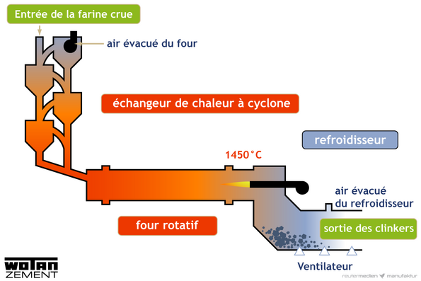 La farine est préchauffée avant de passer dans le four rotatif à une température d'environ 1450 degrés Celsius. À cette température les minéraux constituant la farine réagissent et se transforment en clinker. Après être passés par le refroidisseur nous pouvons continuer à transformer le clinker.