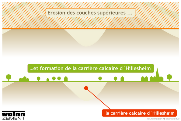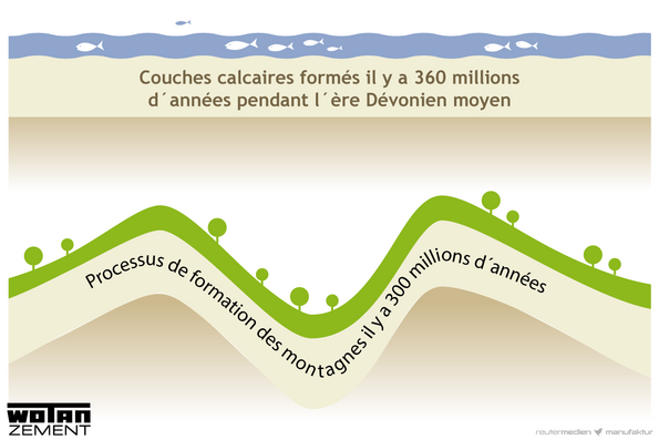 Le calcaire et la marne naturels sont les matières premières qui servent à la fabrication du ciment. Il y a près de 380 millions d'années, les coraux et les formes de vie fossiles ont fait apparaître nos calcaires dans la mer peu profonde du Dévonien moyen. Au cours des millénaires le calcaire a été couvert par d´autres couches et s´est solidifié en roche. Après le temps de frittage et leur érosion, la carrière d`Hillesheim s´est formé. Le calcaire et la marne sont extraits par minage. Ensuite les matériaux sont transportés par camions jusqu´au concasseur pour y être concassés puis sont stockés dans des silos.